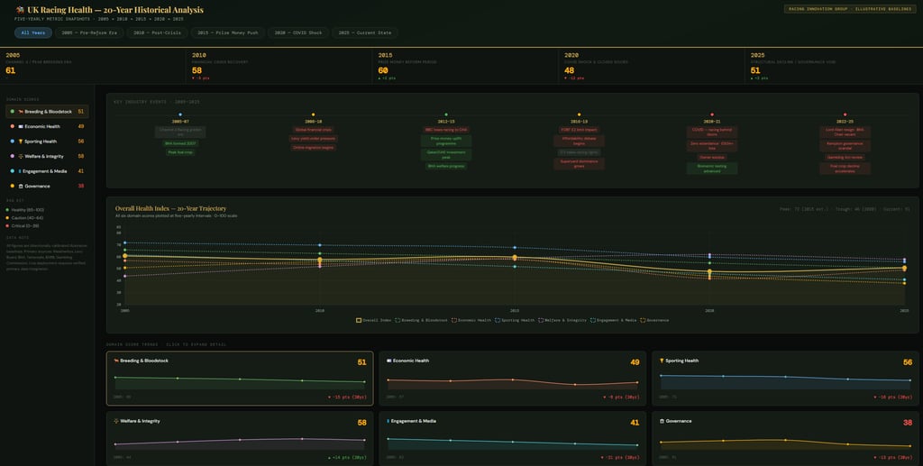 The twenty-year trend data embedded in the Vital Signs Dashboard is not comfortable reading, and it was not designed to be. The breeding domain — the sport's primary leading indicator, the canary in the coal mine, the metric that tells you where racing will be in 2028 more accurately than anything the current leadership will say at Cheltenham — scores 51 out of 100 in 2025, down from 66 in 2005. Governance sits at 38 — the lowest domain in the framework — with the BHA governance trust sub-score estimated at 31 out of 100. Anyone who has attended an industry conference, read the trade press with genuine critical engagement, or simply spoken candidly with owners and trainers in the past three years will find that figure not merely credible but arguably generous.
