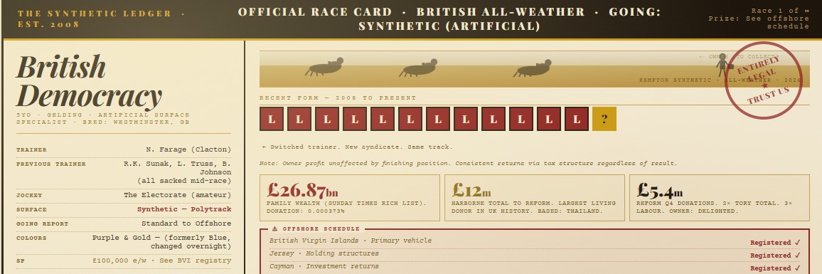 Meanwhile, the actual money — the £26.87 billion, the Admiralty Arch rental income, the Millbank Tower office leases, the dividends quietly accumulating in structures registered in places with no capital gains tax and a suspiciously good climate — continues its unhurried journey through the international financial system, entirely untroubled by whatever is happening on the synthetic surface of British politics. The horses go round. The politicians give speeches. The punters get wet. And somewhere, in a well-appointed office in a low-tax jurisdiction, the form book is being updated with the cool precision of men who have always understood that the real money is never in picking the winner.
