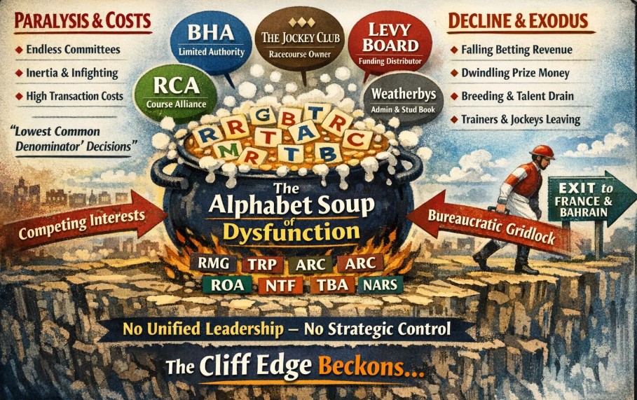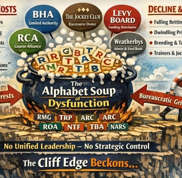 Attempt to understand British racing's governance and you quickly encounter a bewildering proliferation of bodies, each with overlapping remits, competing interests, and their own bureaucratic imperatives. The BHA. The Jockey Club. The RCA. Weatherbys. The Levy Board. Great British Racing. Racing Enterprises Limited. The Thoroughbred Group. The ROA, NTF, TBA, PJA, NARS. RMG. TRP. ARC. The Racing Foundation. British Champions Series. Britbet. Each acronym represents offices, boards, committees, executives, and—inevitably—costs.